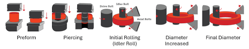 En cambio, la forja por laminación implica el uso de rodillos en lugar de matrices. Esto permite una producción rápida, reduce los costos de herramientas y reduce el desperdicio de materiales. Se utiliza mejor con componentes como varillas, ejes y anillos que requieren gran resistencia y eficiencia, pero no deben ser muy complejos.